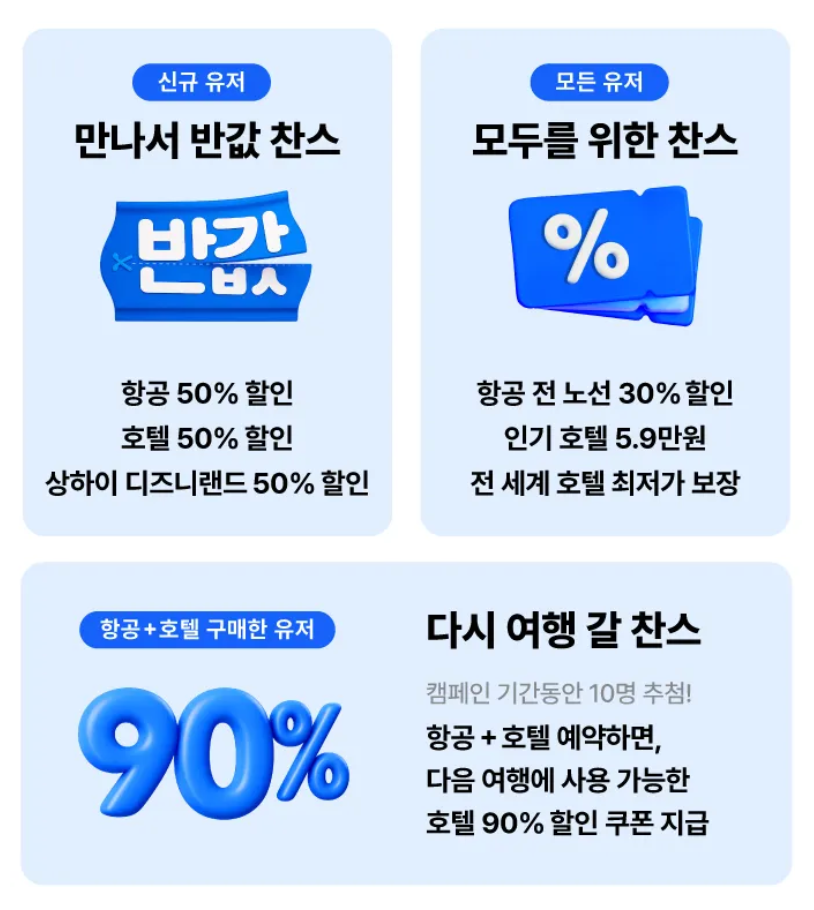 - 특가 예약 시 다음 여행에 쓸 수 있는 90% 할인쿠폰 제공